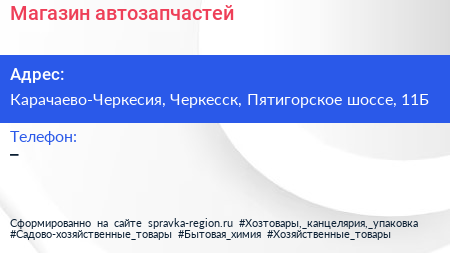 Магазин автозапчастей по адресу Карачаево-Черкесия, Черкесск, Пятигорское шоссе, 11Б в дальнейшем Организация, размещена в следующих категориях: