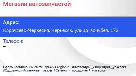 Магазин автозапчастей по адресу Карачаево-Черкесия, Черкесск, улица Кочубея, 172 в дальнейшем Организация, размещена в следующих категориях: