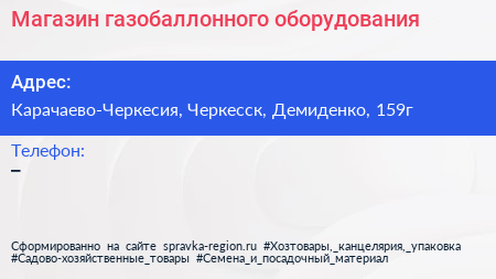 Магазин газобаллонного оборудования по адресу Карачаево-Черкесия, Черкесск, Демиденко, 159г в дальнейшем Организация, размещена в следующих категориях: