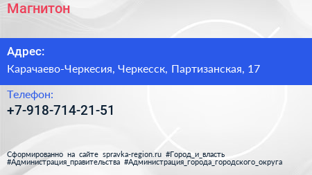 Магнитон по адресу Карачаево-Черкесия, Черкесск, Партизанская, 17 в дальнейшем Организация, размещена в следующих категориях: