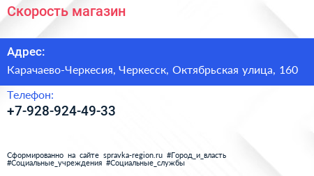 Скорость, магазин по адресу Карачаево-Черкесия, Черкесск, Октябрьская улица, 160 в дальнейшем Организация, размещена в следующих категориях: