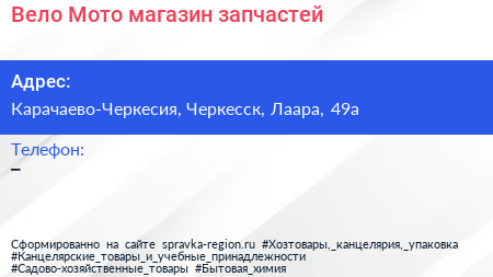 Вело-Мото, магазин запчастей по адресу Карачаево-Черкесия, Черкесск, Лаара, 49а в дальнейшем Организация, размещена в следующих категориях: