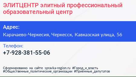 ЭЛИТЦЕНТР, элитный профессиональный образовательный центр по адресу Карачаево-Черкесия, Черкесск, Кавказская улица, 56 в дальнейшем Организация, размещена в следующих категориях: