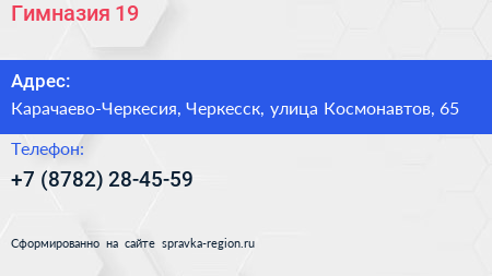 Гимназия №19 по адресу Карачаево-Черкесия, Черкесск, улица Космонавтов, 65 в дальнейшем Организация, размещена в следующих категориях: