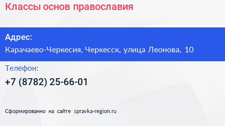 Классы основ православия по адресу Карачаево-Черкесия, Черкесск, улица Леонова, 10 в дальнейшем Организация, размещена в следующих категориях:
