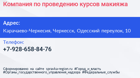 Компания по проведению курсов макияжа по адресу Карачаево-Черкесия, Черкесск, Одесский переулок, 10 в дальнейшем Организация, размещена в следующих категориях: