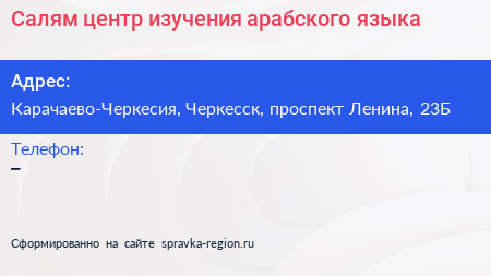 Салям, центр изучения арабского языка по адресу Карачаево-Черкесия, Черкесск, проспект Ленина, 23Б в дальнейшем Организация, размещена в следующих категориях: