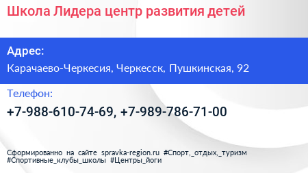 Школа Лидера, центр развития детей по адресу Карачаево-Черкесия, Черкесск, Пушкинская, 92 в дальнейшем Организация, размещена в следующих категориях: