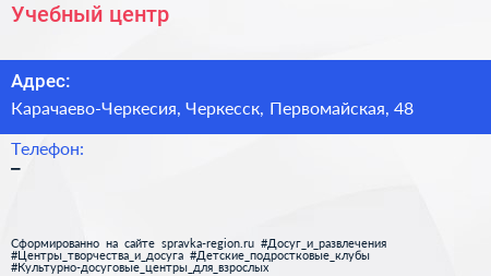 Учебный центр по адресу Карачаево-Черкесия, Черкесск, Первомайская, 48 в дальнейшем Организация, размещена в следующих категориях: