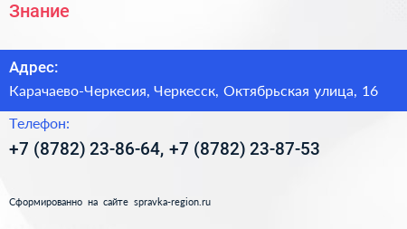 Знание по адресу Карачаево-Черкесия, Черкесск, Октябрьская улица, 16 в дальнейшем Организация, размещена в следующих категориях:
