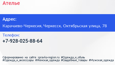 Ателье по адресу Карачаево-Черкесия, Черкесск, Октябрьская улица, 78 в дальнейшем Организация, размещена в следующих категориях: