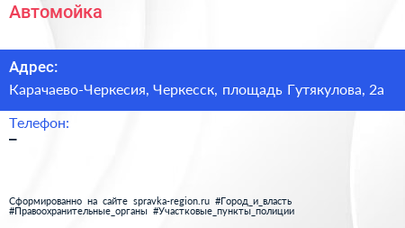 Автомойка по адресу Карачаево-Черкесия, Черкесск, площадь Гутякулова, 2а в дальнейшем Организация, размещена в следующих категориях: