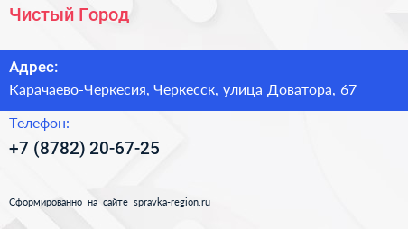 Чистый Город по адресу Карачаево-Черкесия, Черкесск, улица Доватора, 67 в дальнейшем Организация, размещена в следующих категориях: