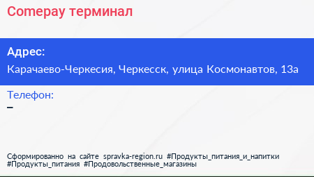 Comepay, терминал по адресу Карачаево-Черкесия, Черкесск, улица Космонавтов, 13а в дальнейшем Организация, размещена в следующих категориях: