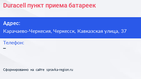 Duracell, пункт приема батареек по адресу Карачаево-Черкесия, Черкесск, Кавказская улица, 37 в дальнейшем Организация, размещена в следующих категориях: