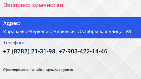 Экспресс, химчистка по адресу Карачаево-Черкесия, Черкесск, Октябрьская улица, 98 в дальнейшем Организация, размещена в следующих категориях: