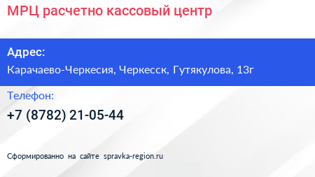 МРЦ, расчетно-кассовый центр по адресу Карачаево-Черкесия, Черкесск, Гутякулова, 13г в дальнейшем Организация, размещена в следующих категориях: