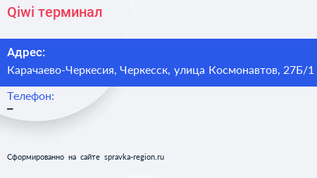 Qiwi, терминал по адресу Карачаево-Черкесия, Черкесск, улица Космонавтов, 27Б/1 в дальнейшем Организация, размещена в следующих категориях: