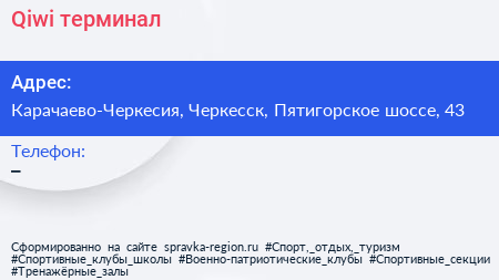 Qiwi, терминал по адресу Карачаево-Черкесия, Черкесск, Пятигорское шоссе, 43 в дальнейшем Организация, размещена в следующих категориях: