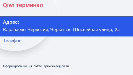 Qiwi, терминал по адресу Карачаево-Черкесия, Черкесск, Шоссейная улица, 2а в дальнейшем Организация, размещена в следующих категориях: