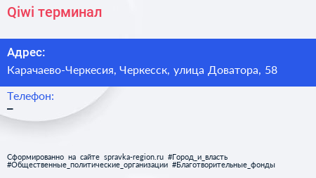 Qiwi, терминал по адресу Карачаево-Черкесия, Черкесск, улица Доватора, 58 в дальнейшем Организация, размещена в следующих категориях: