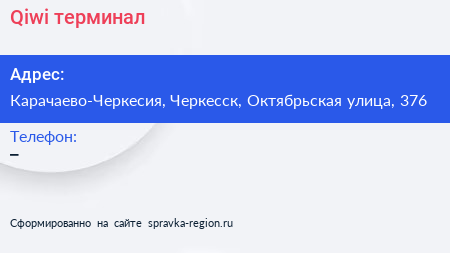 Qiwi, терминал по адресу Карачаево-Черкесия, Черкесск, Октябрьская улица, 376 в дальнейшем Организация, размещена в следующих категориях: