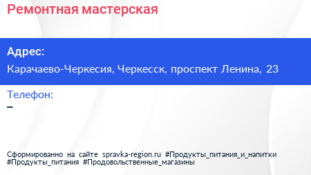 Ремонтная мастерская по адресу Карачаево-Черкесия, Черкесск, проспект Ленина, 23 в дальнейшем Организация, размещена в следующих категориях: