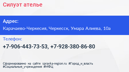 Силуэт, ателье по адресу Карачаево-Черкесия, Черкесск, Умара Алиева, 10а в дальнейшем Организация, размещена в следующих категориях: