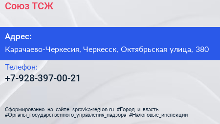 Союз, ТСЖ по адресу Карачаево-Черкесия, Черкесск, Октябрьская улица, 380 в дальнейшем Организация, размещена в следующих категориях: