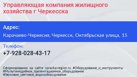 Управляющая компания жилищного хозяйства г. Черкесска по адресу Карачаево-Черкесия, Черкесск, Октябрьская улица, 15 в дальнейшем Организация, размещена в следующих категориях: