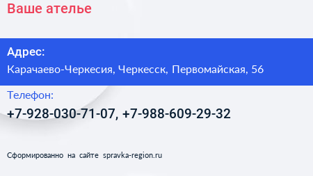 Ваше ателье по адресу Карачаево-Черкесия, Черкесск, Первомайская, 56 в дальнейшем Организация, размещена в следующих категориях: