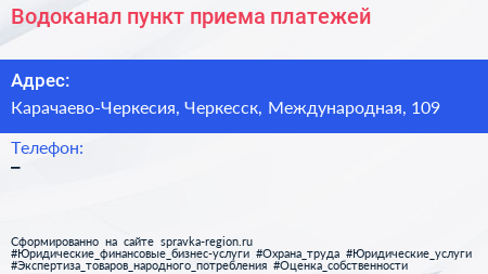 Водоканал, пункт приема платежей по адресу Карачаево-Черкесия, Черкесск, Международная, 109 в дальнейшем Организация, размещена в следующих категориях: