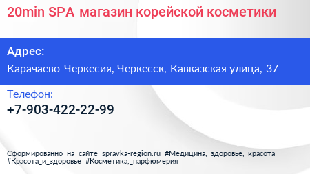 20min SPA, магазин корейской косметики по адресу Карачаево-Черкесия, Черкесск, Кавказская улица, 37 в дальнейшем Организация, размещена в следующих категориях: