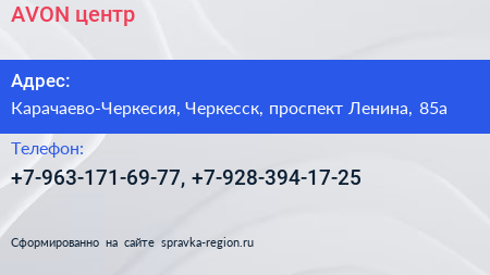 AVON, центр по адресу Карачаево-Черкесия, Черкесск, проспект Ленина, 85а в дальнейшем Организация, размещена в следующих категориях: