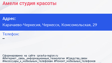 Амели, студия красоты по адресу Карачаево-Черкесия, Черкесск, Комсомольская, 29 в дальнейшем Организация, размещена в следующих категориях:
