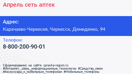 Апрель, сеть аптек по адресу Карачаево-Черкесия, Черкесск, Демиденко, 94 в дальнейшем Организация, размещена в следующих категориях: