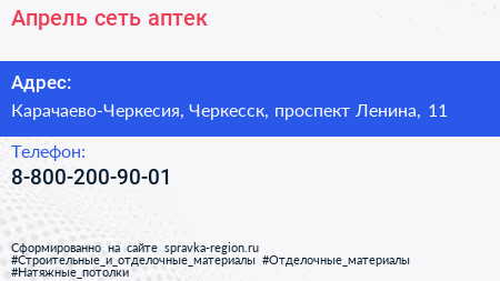 Апрель, сеть аптек по адресу Карачаево-Черкесия, Черкесск, проспект Ленина, 11 в дальнейшем Организация, размещена в следующих категориях: