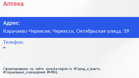 Аптека по адресу Карачаево-Черкесия, Черкесск, Октябрьская улица, 39 в дальнейшем Организация, размещена в следующих категориях: