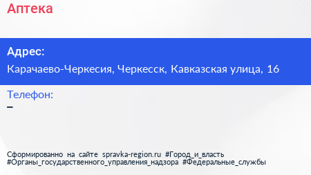 Аптека по адресу Карачаево-Черкесия, Черкесск, Кавказская улица, 16 в дальнейшем Организация, размещена в следующих категориях: