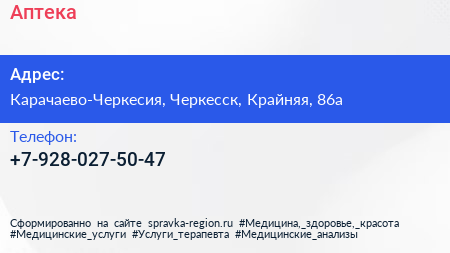 Аптека по адресу Карачаево-Черкесия, Черкесск, Крайняя, 86а в дальнейшем Организация, размещена в следующих категориях: