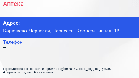 Аптека по адресу Карачаево-Черкесия, Черкесск, Кооперативная, 19 в дальнейшем Организация, размещена в следующих категориях: