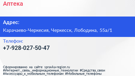 Аптека по адресу Карачаево-Черкесия, Черкесск, Лободина, 55а/1 в дальнейшем Организация, размещена в следующих категориях: