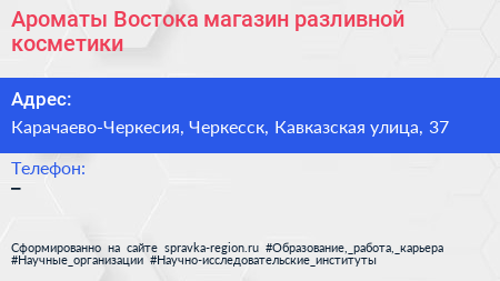Ароматы Востока, магазин разливной косметики по адресу Карачаево-Черкесия, Черкесск, Кавказская улица, 37 в дальнейшем Организация, размещена в следующих категориях: