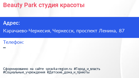 Beauty Park, студия красоты по адресу Карачаево-Черкесия, Черкесск, проспект Ленина, 87 в дальнейшем Организация, размещена в следующих категориях: