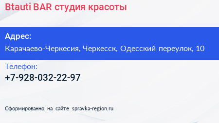 Btauti BAR, студия красоты по адресу Карачаево-Черкесия, Черкесск, Одесский переулок, 10 в дальнейшем Организация, размещена в следующих категориях:
