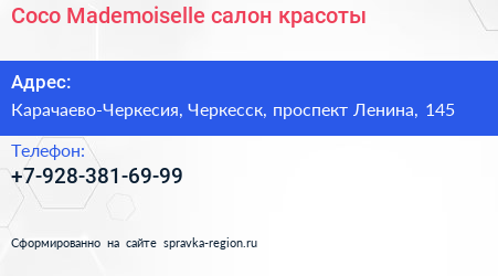Coco Mademoiselle, салон красоты по адресу Карачаево-Черкесия, Черкесск, проспект Ленина, 145 в дальнейшем Организация, размещена в следующих категориях: