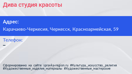 Дива, студия красоты по адресу Карачаево-Черкесия, Черкесск, Красноармейская, 59 в дальнейшем Организация, размещена в следующих категориях: