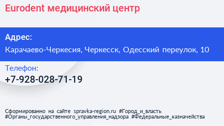 Eurodent, медицинский центр по адресу Карачаево-Черкесия, Черкесск, Одесский переулок, 10 в дальнейшем Организация, размещена в следующих категориях: