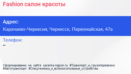 Fashion, салон красоты по адресу Карачаево-Черкесия, Черкесск, Первомайская, 47а в дальнейшем Организация, размещена в следующих категориях: