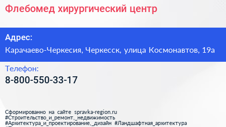 Флебомед, хирургический центр по адресу Карачаево-Черкесия, Черкесск, улица Космонавтов, 19а в дальнейшем Организация, размещена в следующих категориях: